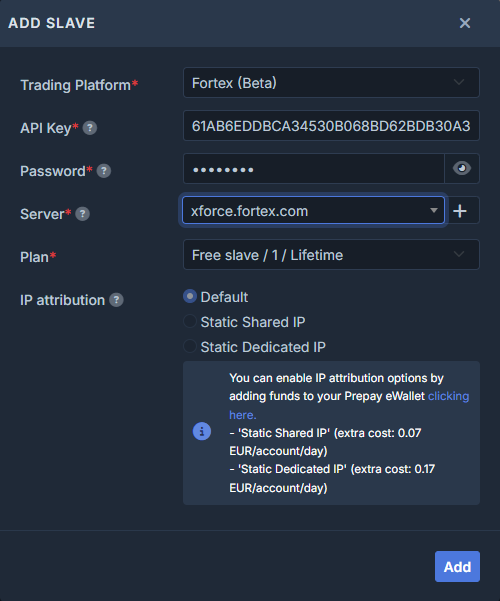 (2)點擊「Add Slave」,填寫Fortex交易平臺的API密鑰、API密碼和服務器,然後點擊「Add」按鈕。API密鑰可通過BO7創建並跟單