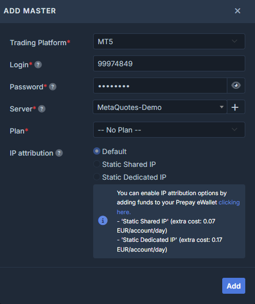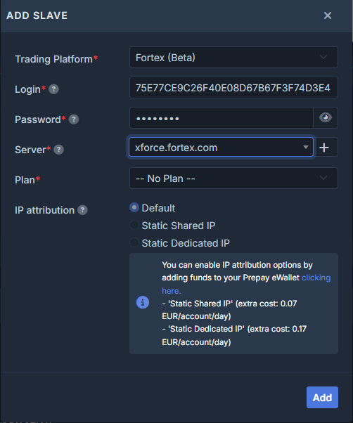 (2)点击“Add Slave”,填写Fortex交易平台的API密钥、API密码和服务器,然后点击“Add”按钮。API密钥可通过BO7创建并复制,API密钥获取和复制详细步骤可查看本文内Option 2。